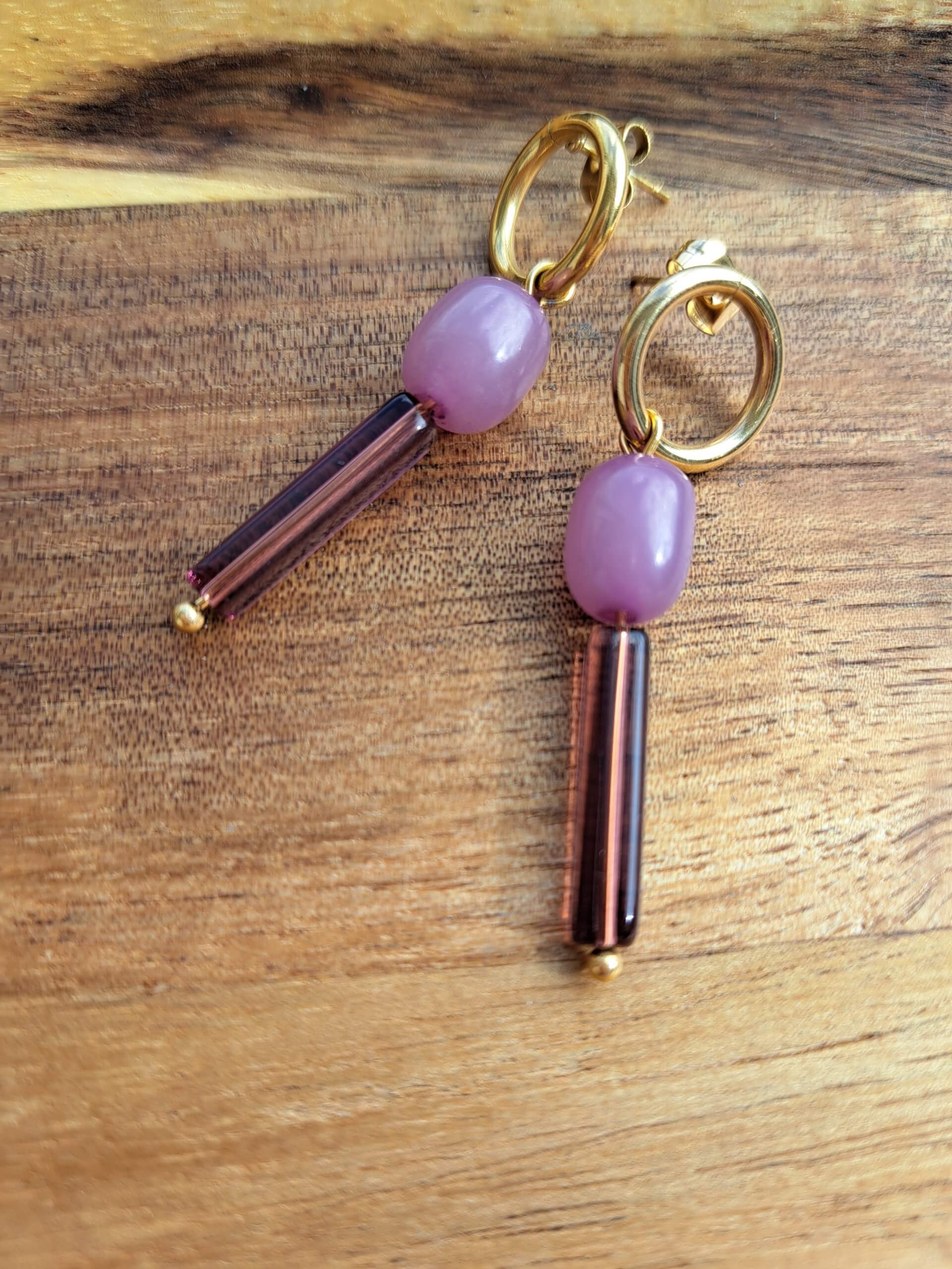 Roestvrij stalen oorbellen met ring met resin kraal en glastube (paars).